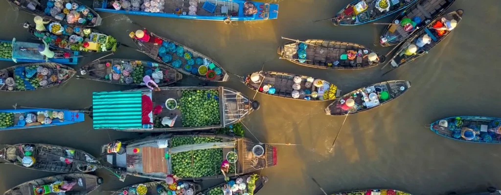 Le delta du Mékong clôt le voyage sur un rythme lent et contemplatif. Balade en bateau entre marchés flottants comme Cai Be ou Can Tho, passages entre villages et maisons sur pilotis, comme ceux decrit dans Les terres oubliées de Dương Thu Hương.